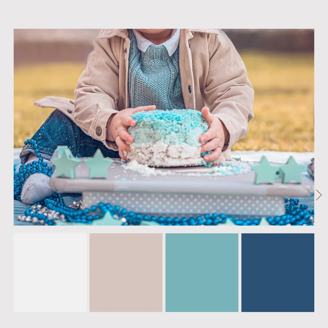 Voici un exemple de la palette de couleurs utilisée pour ce shooting photo d’anniversaire d’un an à Trocadéro. Les parents m’ont communiqué les couleurs du gâteau et de la tenue du bébé pendant la période de préparation de la séance photo. J’ai prévu quelques accessoires de décoration qui ont été placés autour du gâteau pour les photos.
